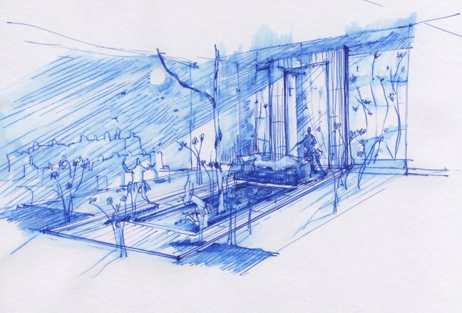 This project is designed for the rendering course (THEA292 – one of required courses for BFA design students), and help students get comfortable with wet media and get ready to start watercolor without fear. Students will create three thumbnails (about 8”x 4” in size), rendering a simple interior box set in perspective with a water based blue pen. After students finish a contour drawing with a blue pen, adding hatching for minimal shading. Then, the wet brush is employed to create impressive moods. During the process of this project, it would be a great idea for students to explore samples of artists’ paintings in varied art media how moods are expressed, and apply their discovery into the rendering. Eventually, students will create three different lighting situations in three thumbnails.